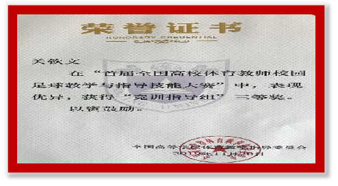 本次大赛是为了深入学习习近平总书记在全国教育大会上讲话精神,落实《国务院办公厅关于强化学校体育促进学生身心健康全面发展的意见》(国办发﹝2016﹞27号)和《教育部等6部门关于加快发展青少年校园足球的实施意见》(教体艺﹝2015﹞6号)文件精神,发挥教指委学校引领示范作用,不断促进学校体育改革中“教会、勤练、常赛”机制的落实而举行的一次全国高校体育教师校园足球教学与指导技能大赛。比赛分为竞训组和教学组,测试内容均为网络评审和现场测试两个环节,其中网络评审项目为教学设计与教学实践,要求网络上传20分钟无删减的教学视频;现场测试为5x20米折返跑、90秒跳绳、28米传准、绕杆运射、1分钟颠球等体能与专项技能项目。比赛异常激烈,精彩纷呈。vwin德赢vwin德赢ac米兰官方关钦文老师作为高水平足球队助理教练参加了竞训组的比赛,并获得三等奖。