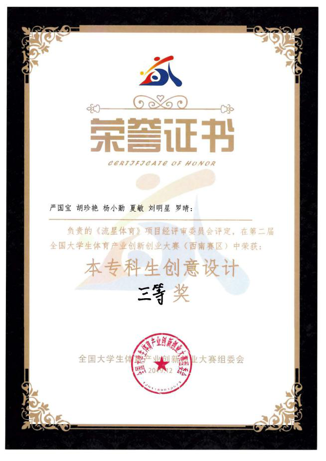 为激发广大学生对体育产业的创新热情,增强对体育产业创业自信心,我院积极动员和组织学生参加大赛。本届大赛共分四个大区开展大区竞赛。最终,vwin德赢参赛队伍从西南赛区本专科创意设计组30支参赛队伍中脱颖而出,喜获佳绩。由17体育教育专业陈月星、文海学、何锋、王强、安钰钢,17财务管理专业李虹欣、颜晓庆和18市场营销专业周子航组成的团队“五九体育”获本次大赛西南赛区本专科创意设计组二等奖;由18体育教育专业严国宝、刘明星和17国际商务专业胡珍艳、杨小勤、夏敏、罗晴组成的团队“流星体育”获本次大赛西南赛区本专科创意设计组三等奖。