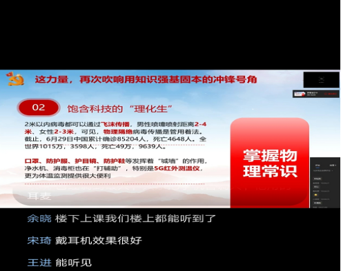 此次微党课以《让党旗在防控疫情斗争第一线高高飘扬》为主题,围绕“吹响用知识强基固本的冲锋号角”、“表达以大爱凝神聚气的中华传承”、“催生靠强能矢志报国的行动自觉”、“誓成为一名防控疫情斗争的合格党员”等四个部分向全体参与学习的党员同志们阐释:“在抗击疫情的斗争中,广大党员同志理应争做一名合格的共产党员,身先士卒,国家一定能打赢这场人民战、总体战、阻击战,战斗中迸发出磅礴的力量,必将更加强化我们的使命担当。”整场微党课从文化传承、数字语言、科学技术、高尚品德和政治法纪等多个维度,向党员同志们展现了坚持“四个自信”,做到“两个维护”,树立人类命运共同体意识的重要性。整个专题阐明了防控疫情斗争对全体党员的要求:“广大党员同志们要时刻保持共产党员的先锋模范作用,坚决落实政治合格、执行纪律合格、品德合格、发挥作用合格等要求。”此次专题深入浅出、案例鲜活、效果显著,用事实和数据为广大党员同志们呈现出中国共产党立党为公、执政为民,以人民为中心的磅礴力量。