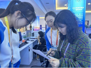 甘立琼同学核对赛事信息李俊龙同学引导混合区记者采访