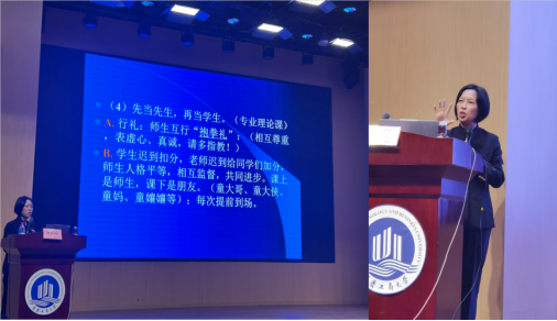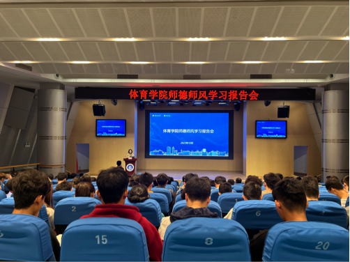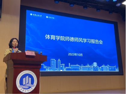 学校师德师风先进个人童世敏教授以“认认真真做事,踏踏实实做人”为题与师生们分享了她从教37年来在教学、研究、社会服务等方面的成长和收获。在分享中,她以恩师赠予的毕业寄语:“世上最怕‘认真’二字,任何事,只要认真对待,都有可能完成。”谈起,坦诚分享了她如何在学院领导关心和教师前辈帮助下,通过自己坚持不懈努力,实现从毕业后稚嫩胆怯的小姑娘转变为教学经验丰富的老教师的心路历程,实现从专注课堂教学和学院学校事务转变为走出校园和国门,服务国家社会,传播体育运动,弘扬体育精神的感人事迹。积极倡导全院同仁和立志成为教师的同学们要争做思想道德好、身心素质好、体育技能好、教学能力好、师生关系好的“五好”体育教师。