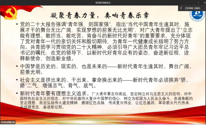随后vwin德赢ac米兰官方学生会功能型团支部进行了成立后的主题团课学习。在新当选学生会功能型团支部组织委员王俊杰的带领下,集体学习党的二十大报告,并号召全体成员深入学习党的二十大精神,坚定不移跟党走,充分发挥先锋模范作用。