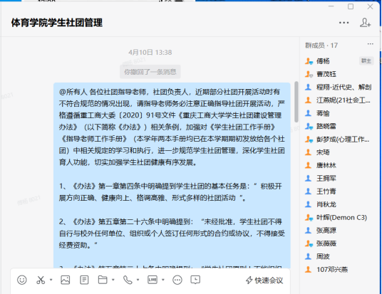 会议最后,张薇薇副书记对学生会、青年志愿协会、学生社团等学生组织提出三点希望:一是希望学生干部能够加强政治理论学习,主动学习宣传贯彻践行党的二十大精神,坚定理想信念,持续深化改革,不断促进学生组织的健康发展;二是各学生组织指导老师和学生干部要充分发挥引领作用,指导老师要加强对学生活动的严格把关和学生干部的管理,多指导并参与各类学生活动、社团活动,及时发现并整改社团建设中存在的突出问题;三是要加强组织规范管理,高度重视学生会、青年志愿协会、学生社团意识形态工作,加强队伍建设,完善学生管理制度,促进学生全面健康发展。