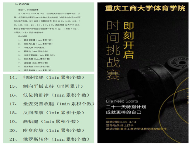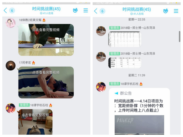 21天养成一个好习惯,从3月25日起,活动每天将会出一个挑战项目,以每个项目限定参赛学生在一分钟内完成的次数(或标准动作坚持时间)作为排序依据。每天锻炼一分钟,健康生活每一天,他们在锻炼中挥洒汗水,在坚持中成长,运动使人拥有健康的体魄。经过长达21天的比赛,女队和男队竞争都比较激烈,终于在4月14日分出胜负,谭宇杭和黄文鳐获得第一名。毕洁庆同学遗憾没能拿第一名,他说:“我虽然没能拿到第一名,但是我锻炼身体,养成一个良好的习惯。”