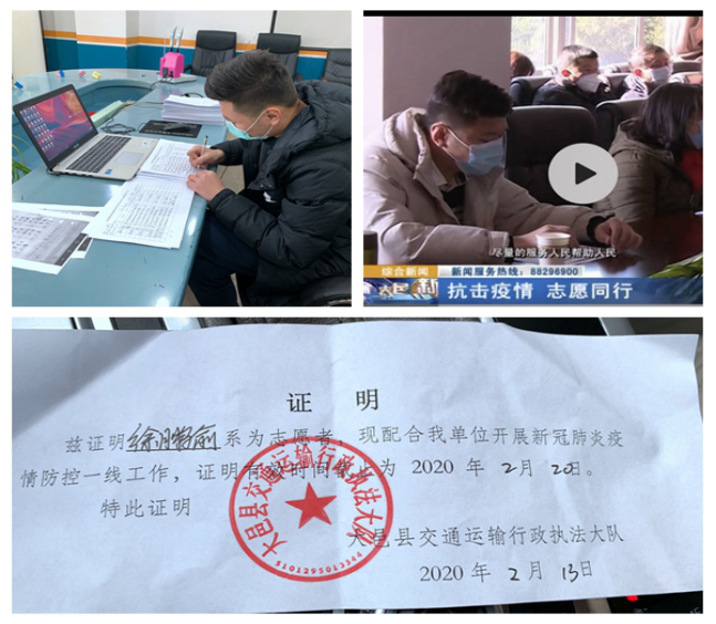 徐鹏俞同学是vwin德赢ac米兰官方2016级体育教育1班的学生,在班级担任心理委员。2020年1月30日,他报名成为了四川省成都市大邑县交通运输行政执法大队的一名志愿者,积极配合有关部门开展新冠肺炎疫情防控工作。他参加轮流值班,在高速路口坚守,对外来出入车辆及人员进行体温测量并对疫情严重地区回来的车辆进行归类入档,登记详细信息,上报异常情况。