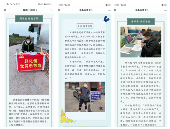王涛同学是vwin德赢ac米兰官方2016级体育教育1班的学生,作为共青团员,他在2020年2月2日报名参加重庆市南川区水江镇古城居委会新型冠状病毒的防控志愿工作。轮流值班,在村口执勤,对外来车辆及人员进行严格登记排查,上报异常情况,积极配合村委会做好防控工作。