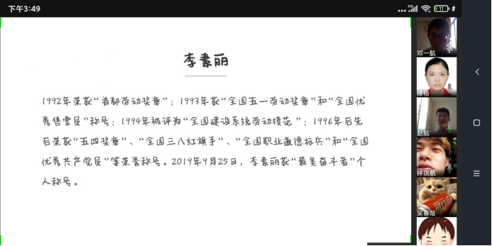 活动中,首先由主持人介绍本次活动主题并宣布活动开始。而后在指导老师傅杨的带领下,了解党中央对于劳模精神和勤俭节约风气的宣传,学习勤俭节约的行为和劳模精神,观看相关新闻资料。随后,由社团部长介绍和认识劳动模范代表,结束后让同学们说说自己身边的劳模,他们的行为和观念对自己的影响,观看相关视频。在学习结束后,进入知识竞赛环节,将关于劳模精神和勤俭节约的相关问题以选择题、填空题的方式展示。答题结束后,主持人向活动参与人员展示了校园内的节约风气。最后,活动在主持人总结后散会。