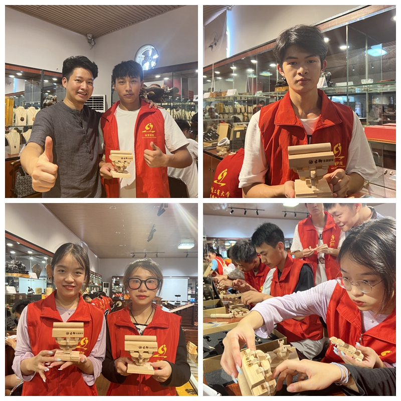 在实践体验基地,传承人周奎向志愿者们讲解了传统木工工具、榫卯结构工艺和家具制作工艺流程。志愿者们还亲自体验了斗拱榫卯积木鲁班锁、孔明锁的拆卸与拼装,使大家零距离领略到中国文化木艺之美,探寻传统木艺的精湛技艺,感受“守”艺人精雕细琢的匠心精神。