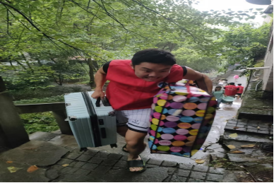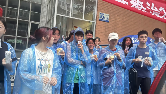 清晨五点过半,天还蒙蒙亮,天上下着瓢泼大雨,50多名志愿者与外国语学院老师与同学在菊园集合,对从江北校区乘车过来的外国语学院大一新生进行公寓搬迁服务。