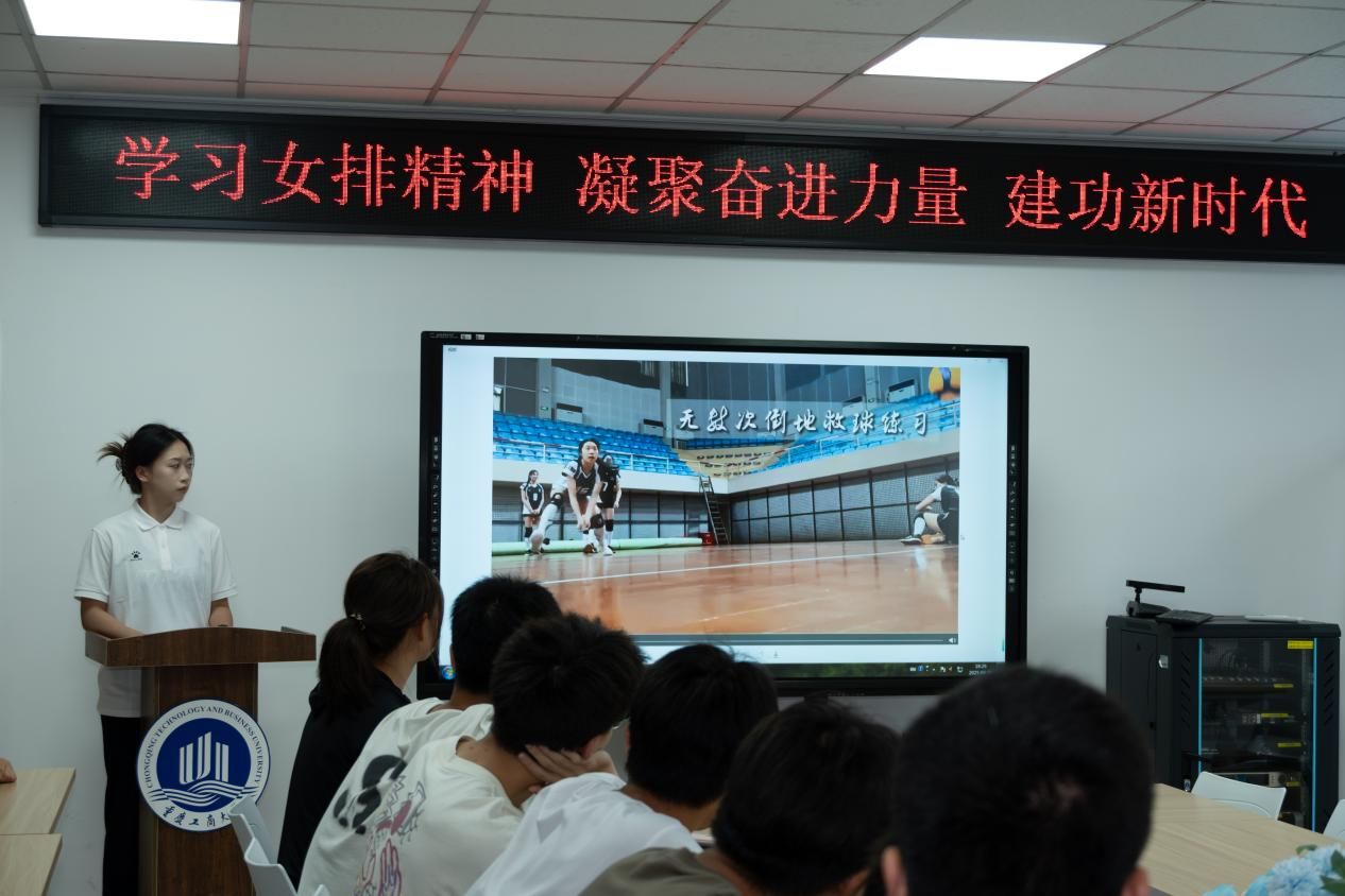 随后,校女排两位功勋队员代表走上讲台,结合自身经历分享了感人至深的感悟。她们讲述了日复一日高强度训练中的汗水与泪水,回顾了赛场逆境中全队上下咬紧牙关、相互支撑最终实现惊天逆转的经典战役,更深情表达了对学校、对教练、对一届届队友的付出的感恩。她们坦言,正是“祖国荣誉高于一切、团队利益重于个人”的坚定信念,铸就了不朽的连冠传奇。这些来自赛场最前沿的真实故事和肺腑之言,深深打动了在场的每一位同学。