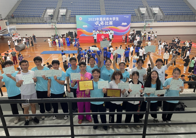 由重庆市教委主办、重庆师范大学承办的2023年重庆市大学生武术比赛,于2023年5月16日—19日在重庆师范大学体育馆举行。此次比赛中,由vwin德赢ac米兰官方黄龙、杨辉两位老师带领的vwin德赢AC米兰合作武术代表队,共斩获个人单项金牌4枚、银牌5枚、铜牌3枚,并获得女子丙组团体总分第二名、男子丙组团体总分第三名的好成绩。武术队学生通过本次比赛不仅获得了武术技能技巧的学习,也加强了和队友之间的竞技合作,增强了团队合作意识和团结进取的拼搏精神。