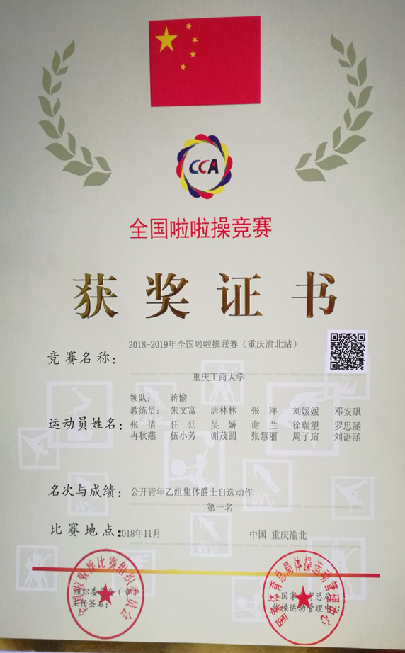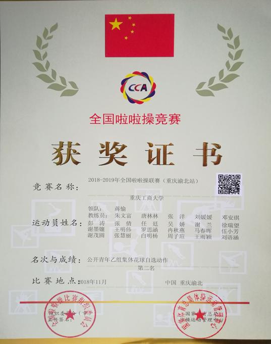 2018年11月,vwin德赢AC米兰合作啦啦操代表队在2018—2019全国啦啦操联赛(重庆渝北站)中获得优异成绩,荣获公开青年乙组集体爵士自选动作冠军、公开青年乙组集体街舞动作冠军、公开青年乙组集体花球自选动作亚军等两项冠军、1项亚军。领队蒋愉,教练员朱文富、唐林林、2015级体育教育张洋、刘媛媛、邓安琪,参赛队员有:2016级体育教育专业(冉秋燕、徐瑞望、罗思涵);2017级体育教育专业(彭涛、谢墨镶、王明伟、白明杨、吴娇、谢兰、伍小芳、谢茂圆、张慧丽);2018级卜星发。